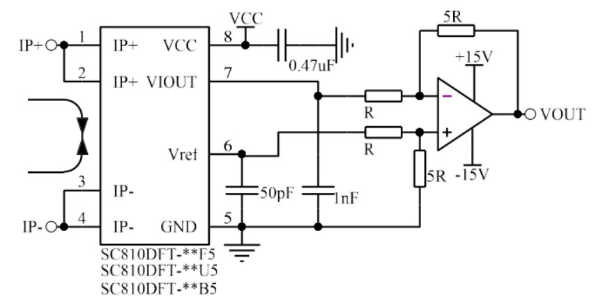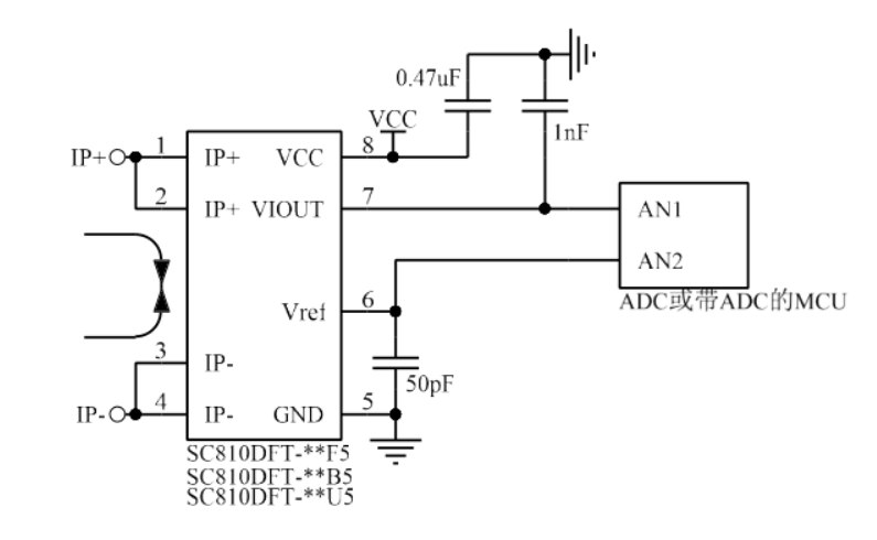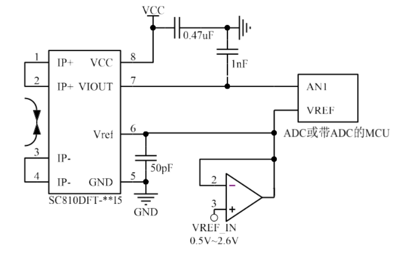 此时 VIOUT= VREF_IN + 灵敏度*IP,其中 VREF_IN 需在 0.5-2.6v 之间。