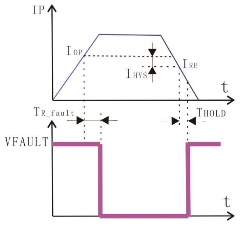 当原边电流超过 IOP且经过 TR_fault时间后,Vfault 引脚置为低电平;